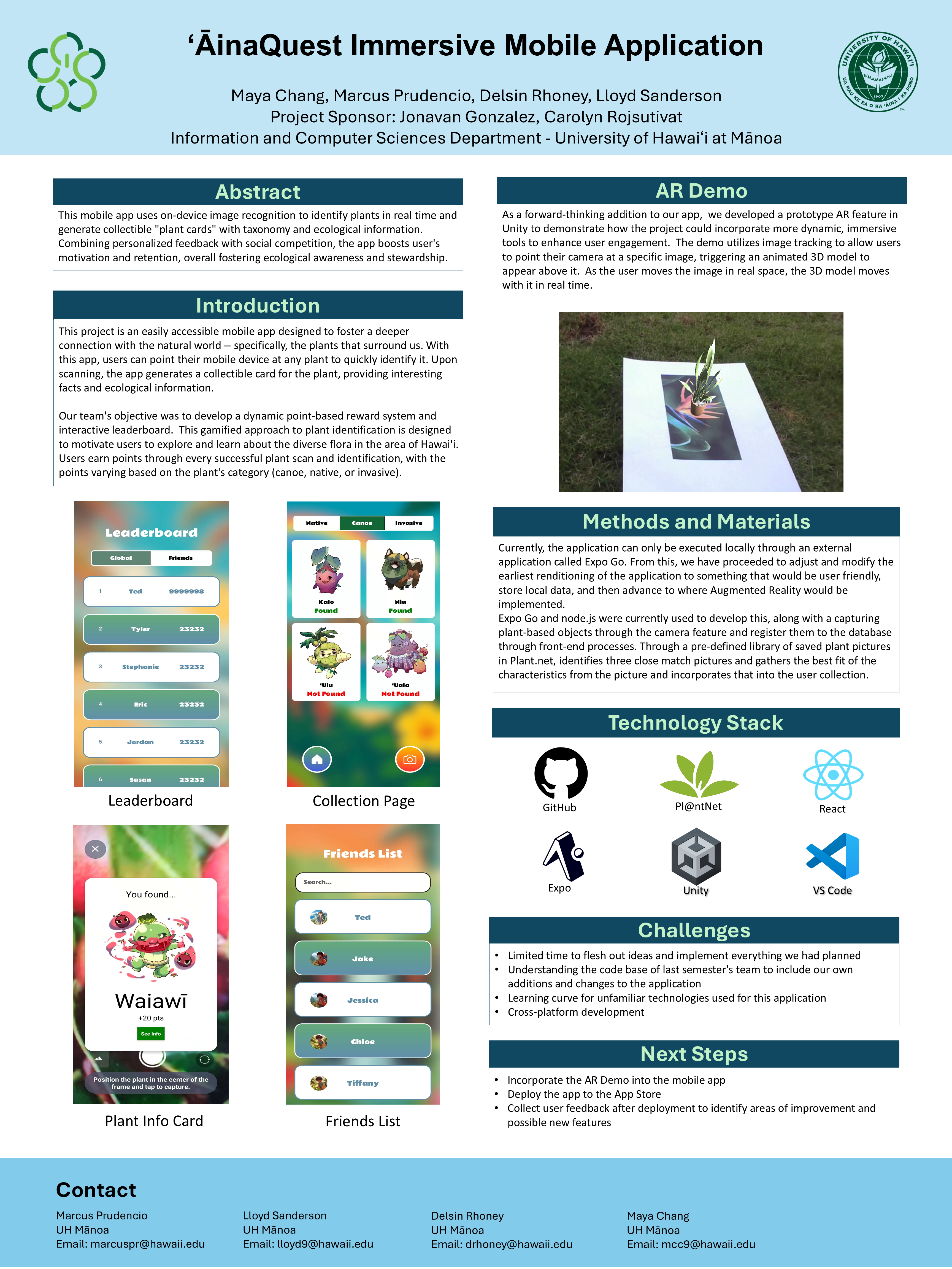 For my capstone project, three teammates and I - working in collaboration with ‘ĀinaQuest - designed and developed a mobile app that aimed to foster a deeper connection with the natural world, specifically native Hawaiian plants. This was achieved through turning the real-world act of identifying plants into a collectible plant-card experience. By scanning plants in our app, users gain a collectible “plant-mon” card and earn points based on the plant’s category (canoe, native, or invasive). Canoe and native plants earned the user more points while invasive plants earned fewer. A leaderboard system was incorporated to encourage ongoing participation and motivate users to explore their environment.