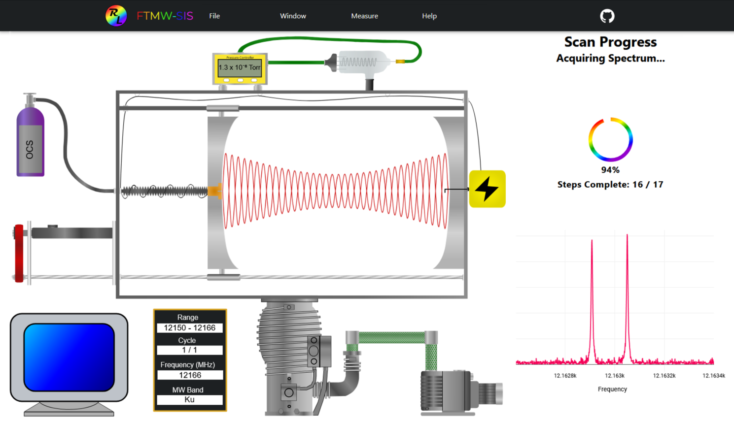 The gas-phase Fourier Transform MicroWave Scientific Instrument Simulator (FTMW-SIS) is the second scientific simulator developed for the Raston Lab. It features an interactive interface that encourages the user to explore the main components of a typical cavity based FTMW spectrometer, and it allows for the setup and acquisition of realistic synthetic rotational spectra for a variety of astrophysically relevant molecules (OCS, C6H5CN, HOCH2CH2OH, NH2CONH2, …). This is achieved using line lists generated with PGOPHER, with additional processing steps that incorporate Doppler splitting, line broadening, and noise to closely mimic real experiments.